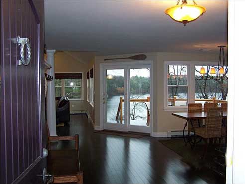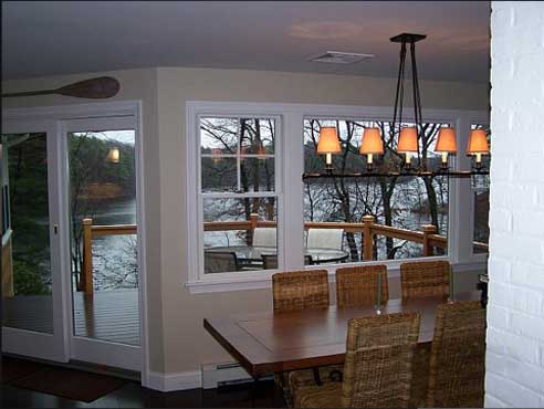 This shows the dramatic view out the slider and across the deck to Lake Cochituate beyond and below.