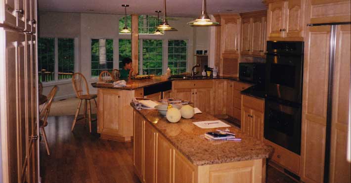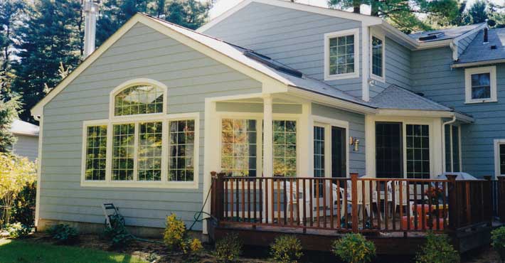This Wayland colonial saw the addition of a 2-car garage, mudroom, master suite above plus a new kitchen, family room and deck.