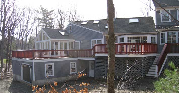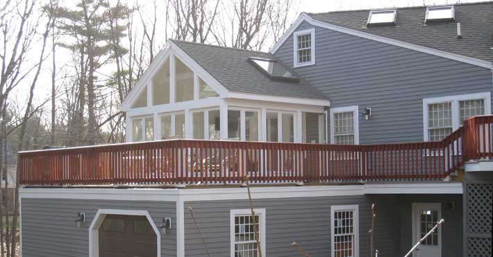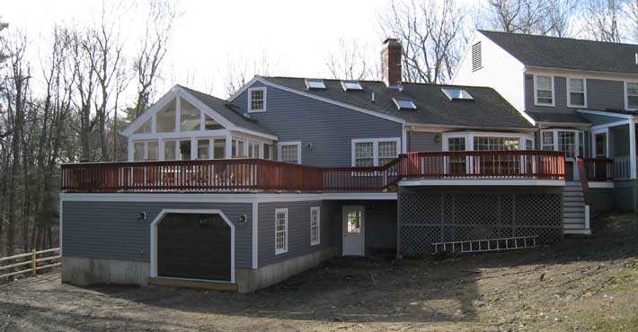 Onto an existing 2-car garage with master suite above, we added more garage space out back using steel support beams. This now 4-car garage (opening on each end) is a great work shop but also provides for an awesome roof deck space with wrap-around deck all the way to the kitchen and new three-season room.